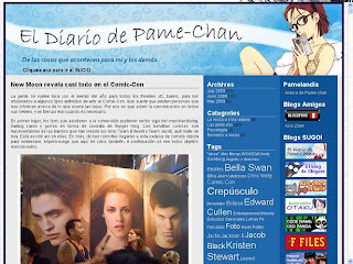 DESDE EL CREPÚSCULO AL… Aunque «diario» nos sugiera un espacio donde un@ anota lo que le sucede en su diario trajín, la más reciente de las blogueras de Sugoi, Pame-chan (de profesión psicóloga, y que no se apellida Chu por si acaso), usa éste más para ponernos al tanto de sus intereses cinematográficos y teleyoutubevisivos (la saga de Twilight, el Bananero, SNL…), musicales (de Michael Jackson está en medio de una reseña de toda su carrera musical), lo mismo que algunas reflexiones y cosas que se le ocurren y ve por allí (como una que publicó los días que los Jonas Brothers pasaron por Lima). Su lema: De las cosas que acontecen para mí y los demás. Un blog variado hecho con sensibilidad.