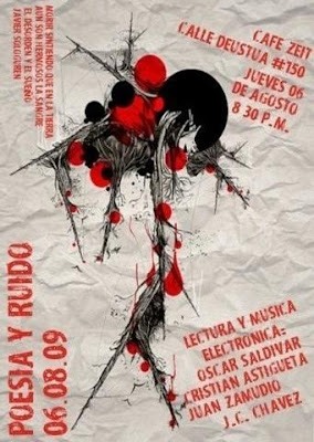 Me ha llegado la invitación a una velada de lectura combinada con música electrónica como fin de fiesta y que se titulará «Poesía y Ruido». La parte poética a cargo de Óscar Saldívar y Juan Zamudio (ambos de Arequipa y que vienen de un encuentro de poetas peruanos y chilenos, y que en Julio y en su tierra organizaron un evento del mismo nombre) y Cristian Astigueta (de Cusco); y la mezcla de «techno, drum’n bass, dubstyle y electro» a cargo de DJ Juan Karlos. La fecha será mañana 6 de agosto; la hora, las 8.30 PM; el lugar, el Café Zeit en la céntrica calle Deustua Nº 150 (o sea, frente al local de la RENIEC). Ah. sí, la entrada será libre; pero si quieres colaborar, habrá venta de material en el mismo local.
