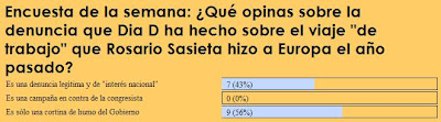 A la pregunta «¿Qué opinas sobre la denuncia que Dia D ha hecho sobre el viaje «de trabajo» que Rosario Sasieta hizo a Europa el año pasado?», mis lectores se han dividido entre los que opinan que tanto escándalo fue sólo una «cortina de humo» más destinada a distraer a la cazuela; y los que opinan que, en cambio, es una denuncia «legítima» y de «interés nacional». Por otro lado, la tercera opción basada en declaraciones de la Doctora Ley de que todo no era sino una campaña para demolerla… no ha tenido ninguna aceptación, a pesar del hecho de que fue el mismo programa y la misma reportera los que difundieron hace un par de meses la denuncia de la ex-felpudina lavapies de la congresista, la actriz amateur María Elena Medianero, contra su ex-patrona por malos tratos.