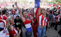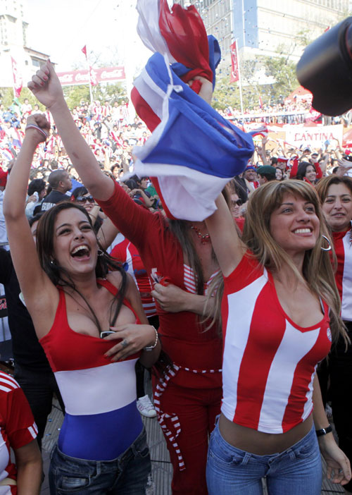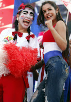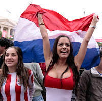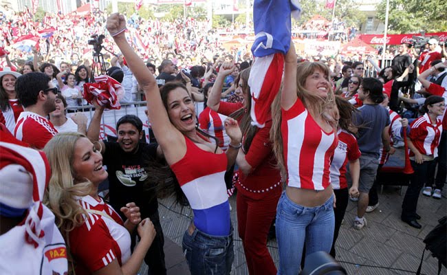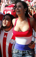 OK, #yoconfieso que no podía dejar pasar el dedicar un post a esta guapa señorita, una de las mejores cosas que nos está dejando este mundial (Ya que no han habido muchos golpes). Recapitulemos: Como todos recordarán (los varones, sobretodo), en el debut de la selección guaraní ante Italia destacó entre tanto aficionado alentando en Asunción una guapa joven… con dos buenos argumentos, y cuyo júbilo tras el pitazo final fue inmortalizado por un avispado fotógrafo de AP. La sorpresa fue saber (gracias al ubicuo Internet) que no era ninguna anónima hincha sino toda una cotizada modelo paraguaya de nombre Larissa Riquelme, la cual entre tanta belleza fue nombrada por la prensa española como “La Novia del Mundial”. Y así, pues, de ser tema de farándula local, la chica en cuestión está logrando una notoriedad inusitada que celebra la frescura y el entusiasmo que le pone para alentar a su selección. Y puesto que Paraguay ha logrado colarse entre los 8 mejores equipos de este Mundial, luego de derrotar esta mañana a Japón, los aficionados esperamos más fotos de ella, y ¿quien sabe? Tal vez y si Paraguay campeona… Larissa ha prometido que al igual que Maradona y Luciana Salazar de Argentina, ella también se desnudaría “pero con mi cuerpo pintado con los colores de Paraguay”. Babeen, idiotas.