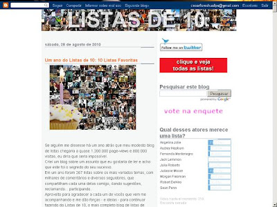 TUS DIEZ PELÍCULAS. Un colega blogger brasileño realiza regularmente recopilación de listas de las más recomendables películas por tipo, temática, autor, o actores protagonistas. 10, un número redondo por excelencia, y un blog que es interesante leer… con el traductor instalado para no perderse nada.