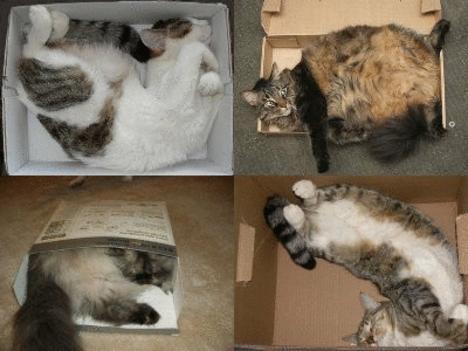 2. Yo me percaté de esto cuando era una niña, me acuerdo que le hice su cama a mi gato porque lo vi durmiendo enroscado en una caja vacia de galletas casino… ni caso le hizo a su nueva cama, se fué a dormir sentado a una caja mas pequeña aun…