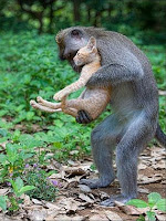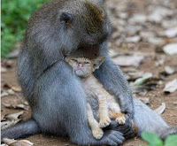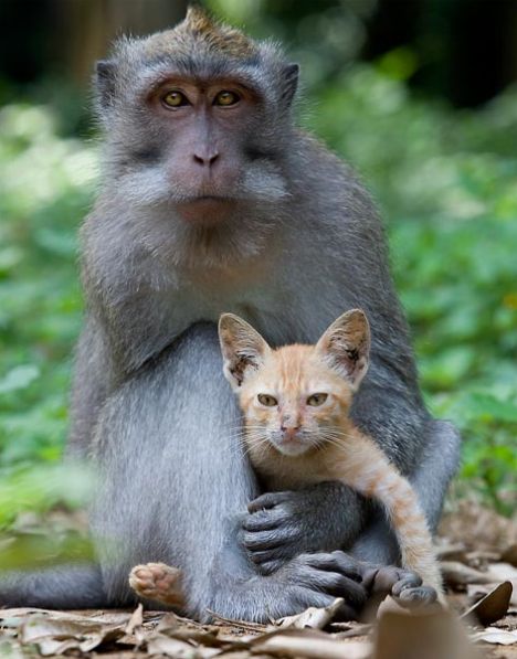 Cuando estaba de vacaciones en Indonesia (aparentemente en el 2008), la fotógrafa amateur Anne Young junto con otros turistas captaron una singular escena: un mono joven, de la raza comúnmente conocida como macaco apareció ante ellos llevando un pequeño gatito naranja. Cabe aclarar que el mono en cuestión es uno salvaje no de zoo ni criado en cautiverio, y que al parecer ha adoptado al minino después de encontrarlo en la selva.