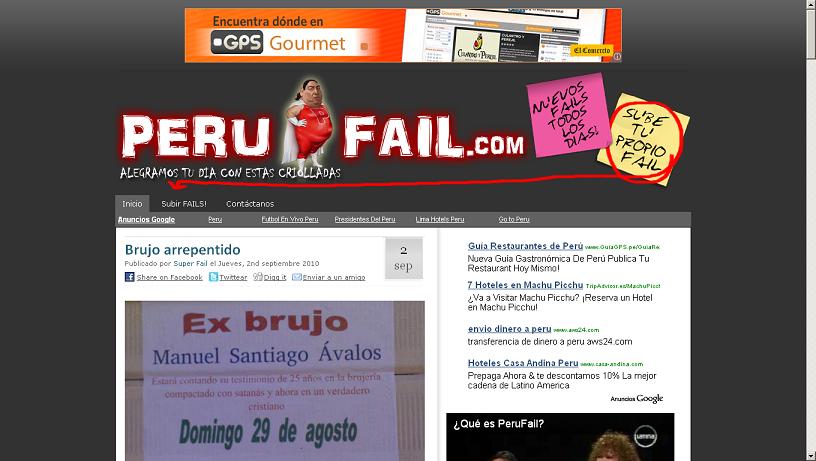 UPSSS. Como los mejores virales, Peru Fail sólo ha necesitado unos pocos meses para posicionarse como una entretenida web. Su idea no es del otro jueves, claro. Simplemente es una colección de imágenes y videos “fail” peruanos captados por los mismos usuarios que luego de compartirlas en facebook las ven publicadas para diversión de todos. Visítala, es un WIN.