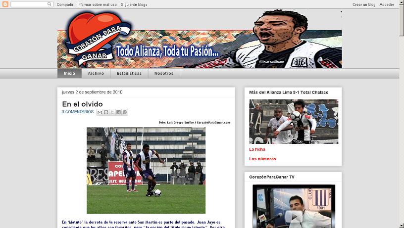 SENTIMIENTO BLANQUIAZUL. Los íntimos tienen su punto de encuentro virtual en Corazón para Ganar, un blog especializado en hacer la cobertura más detallada posible de todo lo referente al Club Alianza Lima, su historia y su participación actual en el campeonato local. Para aliancistas de corazón (valga la redundancia):