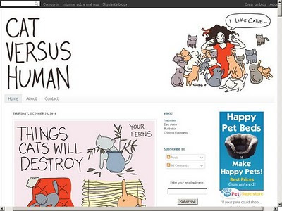 DIBUJANDO GATADAS. En esta ocasión (es sábado o sea SáGATO CATurday) quiero compartir con el respetable este pequeño “catblog” de la artista gráfica Yasmine Surobec, Cat Versus Human, que no es otra cosa que un webcomic dedicado a nuestra felina fascinación por los mininos y sus travesuras. Yasmine, a través de su trazo suave y lleno de tonos pastel, expone allí esas cositas que todo dueño (o debería decir sirviente) de gato conoce de sobra… y que siempre perdonamos. Graciosas anécdotas de una orgullosa mamá de varios michis (y un perro, aporte de su pareja) que por lo menos te arrancarán una sonrisa. Uno de los más populares, el que posteé la semana pasada al final de este post, y que fue mi pretexto para encontrar más. Un blog imperdible. Y si quieres también puedes seguir su grupo de facebook, su flickr, su twitter o su tumblr. Y de la autora su otro blog, A Print A Day, o su web Parasol.