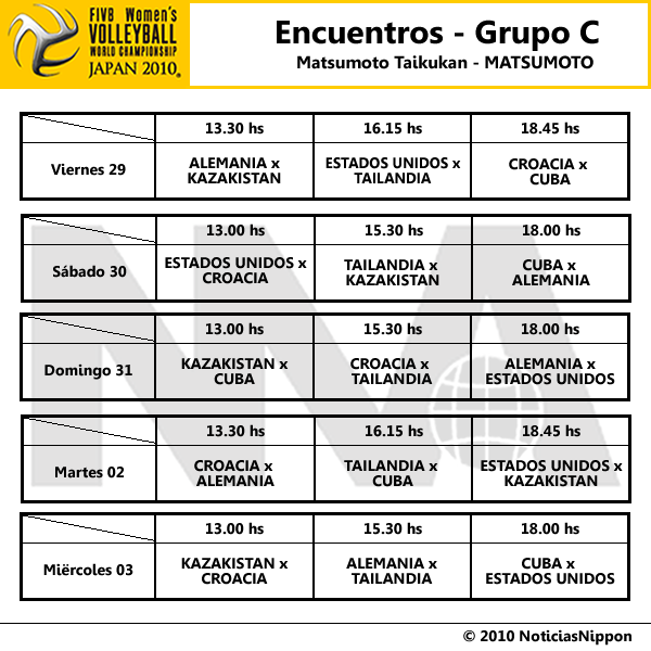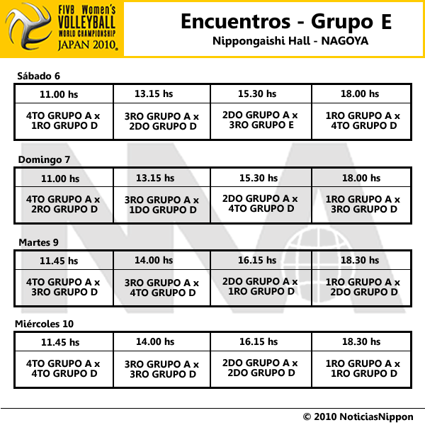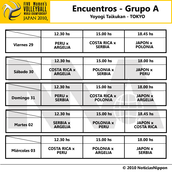 En la web de Noticias Nippon he encontrado estos bonitos cuadros con el fixture oficial del Campeonato. Las horas son de Japón, por lo que en el caso peruano hay que restar 14 horas. Para mayor comodidad, resumiendo, los partidos peruanos serían así (transmitidos por Frecuencia Latina):