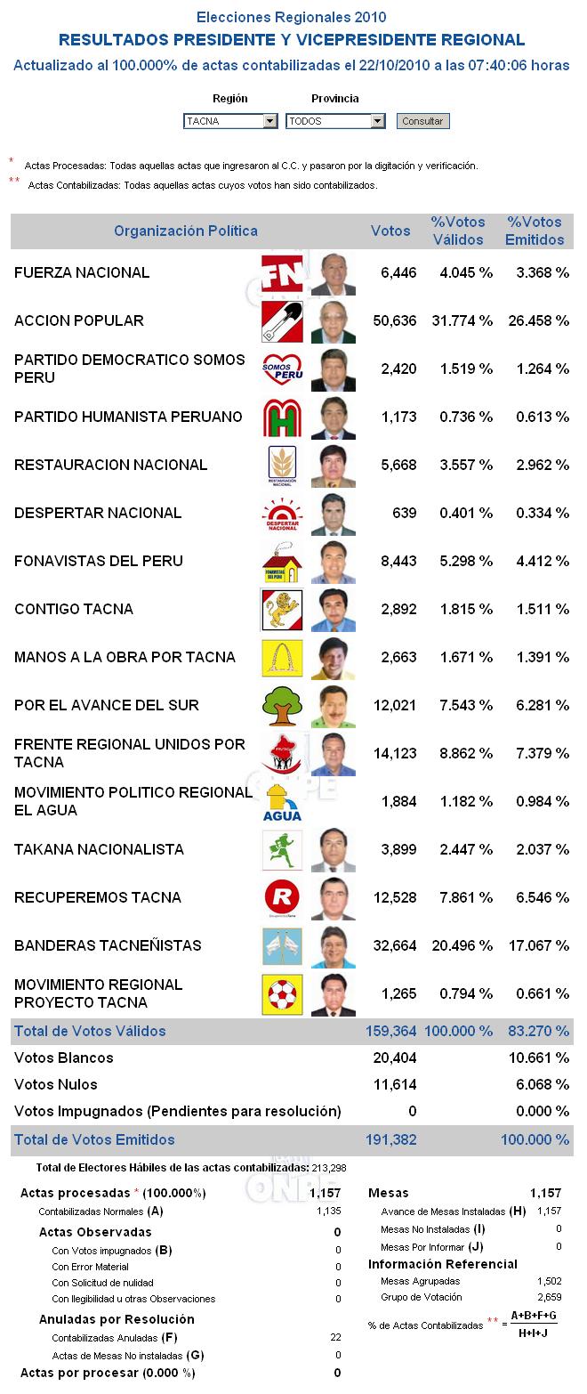 Emocionado por la campaña y aunque no tenia cámara en mano, igual revelé mi voto secreto... como tantos otrosDespués de más de dos semanas de demora, por fin el JEE de Tacna ha terminado de revisar todas las actas observadas y en el portal de la ONPE han aparecido los resultados oficiales para la elección de Presidente y Vicepresidente Regional, y para Consejeros Regionales. No hay gran diferencia con los boca de urna, ni tenía por qué haberla. Al menos en nuestra región las cosas han estado más claras; lamentablemente en otras regiones no pueden decir lo mismo.