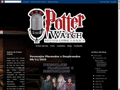 MAGOS AL AIRE: Proyecto del club de fans de la saga de Harry Potter, La Orden del Sol, el programa de radio Potter Watch se emite todos los martes de 8 a 10 PM (hora peruana) a través de FanRadio. Sus conductoras son Negra Black (24) y Tannie Potter (23), fanáticas a rabiar de la historia del chico de la cara rajada, quienes en cada emisión tratan de un tema en específico acerca de curiosidades y elementos singulares del universo pottérico, tanto en los libros como en las películas, con intermedios musicales que combinan pop y rock normales con wizard rock, ese género musical surgido de la afición a estas historias. Se recomienda agregarlos a su skype para hablar al aire y oír sus programas pasados para ponerse en ambiente a pocos días del estreno de la primera parte de Las Reliquias de la Muerte. Vive la magia.