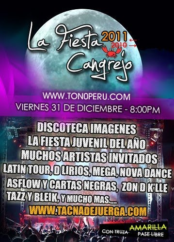 • Hay cada nombre de fiesta. Esta la gente de la Discoteca Imágenes la han bautizado La Fiesta del Cangrejo (vaya Ud. a saber porqué). Tendrá como grupos invitados  a Latin Tour, Mega, Nova Dance, D Lirios, Cartas Negras, Son D’ La Calle, entre otros. A partir de las 8 PM.