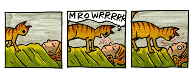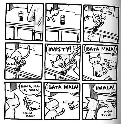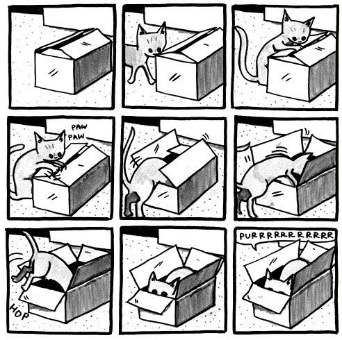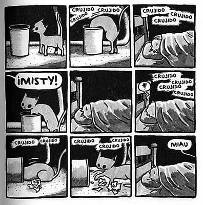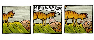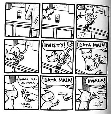 El estadounidense Jeffrey Brown es un reconocido artista gráfico (eufemismo que significa que se gana la vida haciendo garabatos). Obras suyas son los comics Clumsky, Unlikely, AEIOU, Every Girl is the End of the World for Me, Little Things, Bighead, entre otros que tampoco he leído (gracias, wikipedia). Hombre, ¿qué quieren que haga? Vivo en el suburbio de un suburbio de nuestra aldea global, así que agradeceré si me pasan enlace para ver su trabajo en línea… si fuera posible translated in spanish… y sobretodo estas dos: Gato Saliendo de una Bolsa y Otras Observaciones y Los Gatos Son Raros y Más Observaciones que están, como sus títulos y portadas proclaman, dedicados a nuestros felinos inquilinos, sus manías, excentricidades, paranoias, travesuras y rarezas varias que toooodo compañero de gato (sí, compañero, porque si crees que eres el dueño hazte ver) conoce de sobra.