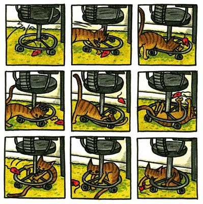 Aceptémoslo, los gatos no piensan como nosotros y harán todo tipo de cosas incomprensibles para nuestra lógica y filosofía, pero ese es su encanto, su superpoder que llena de color nuestras vidas cuando los vemos por allí con la cola en bandera o la garra dispuesta. Por ejemplo al mío le ha dado por cazar cucarachas (como en la última viñeta de este post): el otro día contamos siete cadáveres a medio comer en la sala. Extraño cuando Sammy sólo metía hojas.