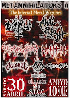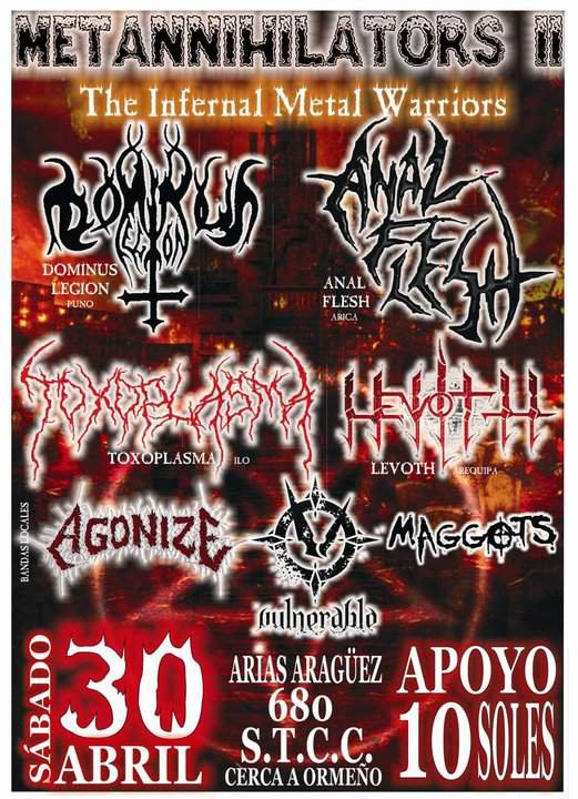 En un ciclo de cine infantil de ingreso libre, en Casa Teatro (Av. 2 de Mayo Nº 565, al costado del colegio Carlos Wiese) se proyectará el clásico moderno de la animación Toy Story a las 10 AM. Desde las 4:30 los chicos del Grupo X proyectan una nueva edición de Locomotion, esta vez con un Especial de J Rock y J Pop. El lugar es el de siempre, el Auditorio de la UPT en San Martín Nº 361, y la entrada es gratuita. En el Teatro El Orfeón (Pasaje Calderón de la Barca Nº 310) se escenificará la obra Neruda cuenta a Neruda. Esta puesta en escena estará a cargo del grupo Teatro Arlequín de Arica, y narra la biografía del gran poeta chileno. La hora es a las 8 PM y la entrada está a partir de S/. 5. En Arias y Aragüez Nº 680 (altura de Ormeño) se congregan las fuerzas de la oscuridad en el evento Metannihilators II, con la participación de las bandas Dominus Legion (de Puno), Anal Flesh (de Arica), Toxoplasma (de Ilo), Levoth (de Arequipa), y los locales Agonize, Vulnerable, y Maggots. Será a partir de las 9 PM, y el apoyo es de S/. 10.El domingo 01/05/2011: