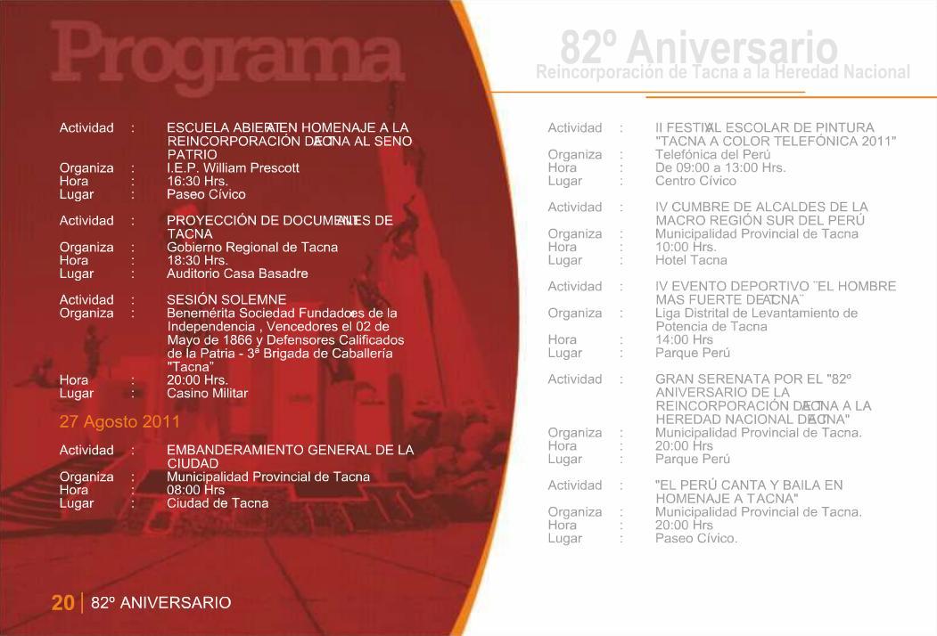 Ciudad hermosa, TACNA / tierra preciosa, / vas derramando, TACNA, / heroicidad… Ochenta y dos años cumple Tacna desde que regresó al Perú. Buen motivo para juerguear, pero al menos recuerden cantar el himno a las doce del sábado.