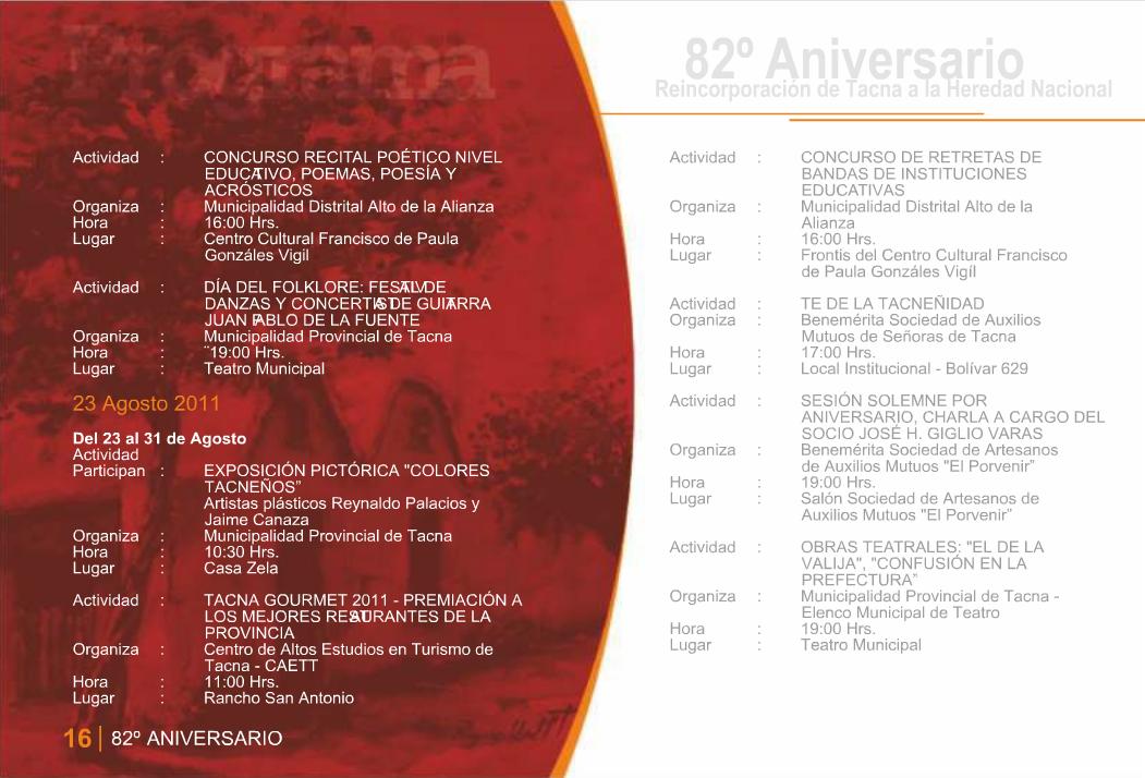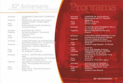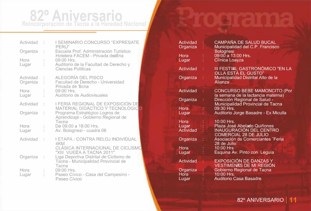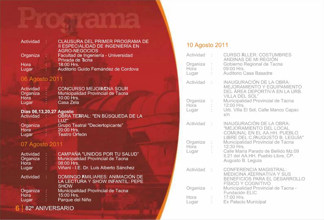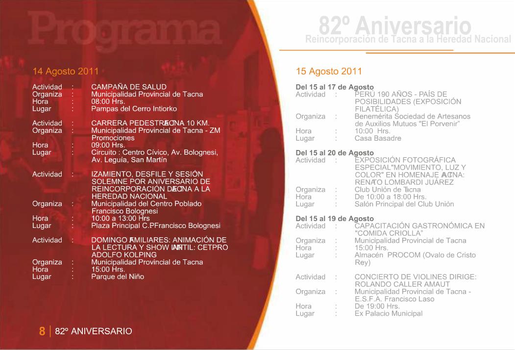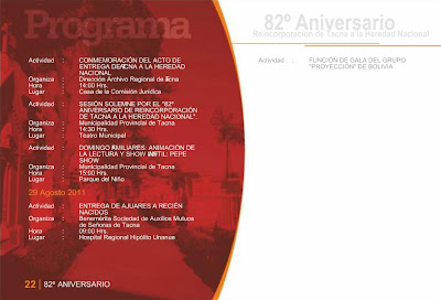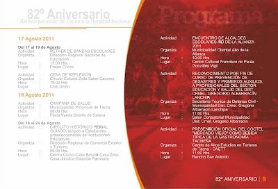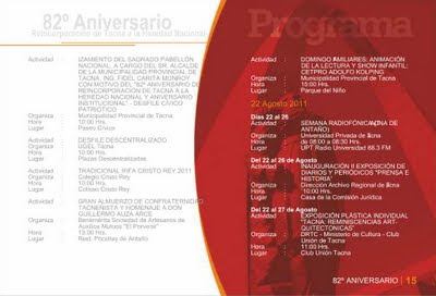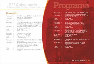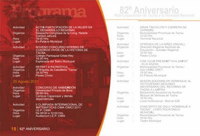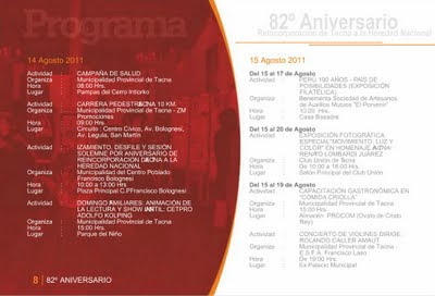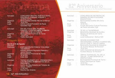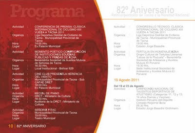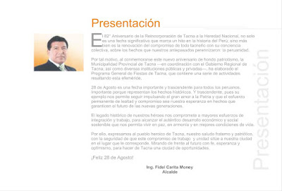 Esta semana el Gobierno Local de la Provincia de Tacna hizo la presentación del programa oficial que conmemora este nuevo aniversario de la Ciudad Heroica. Son 24 páginas que detallan las actividades que distintas instituciones públicas, privadas entre otras entidades, tendrán a su cargo a lo largo de este mes y que ya comenzaron la semana pasada. El archivo original lo puedes consultar en el portal de la Municipalidad Provincial de Tacna o bien en esta presentación hecha a base de las capturas de sus páginas.