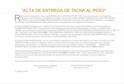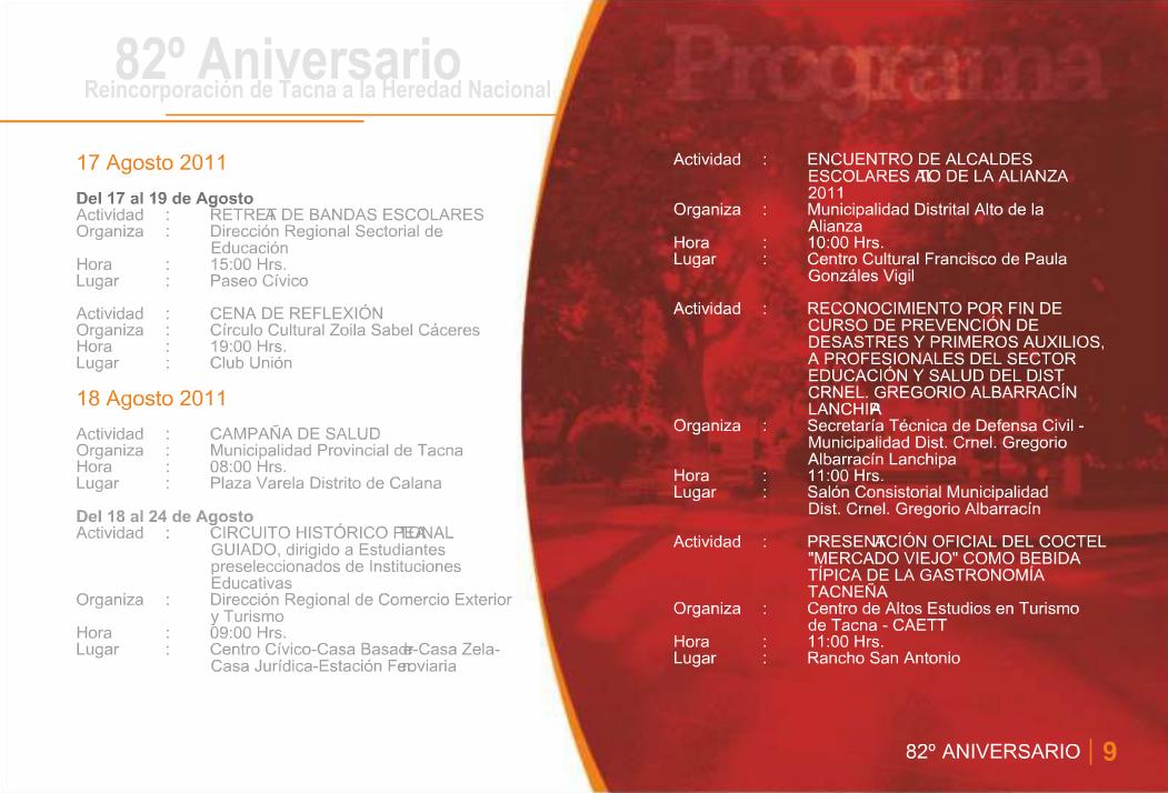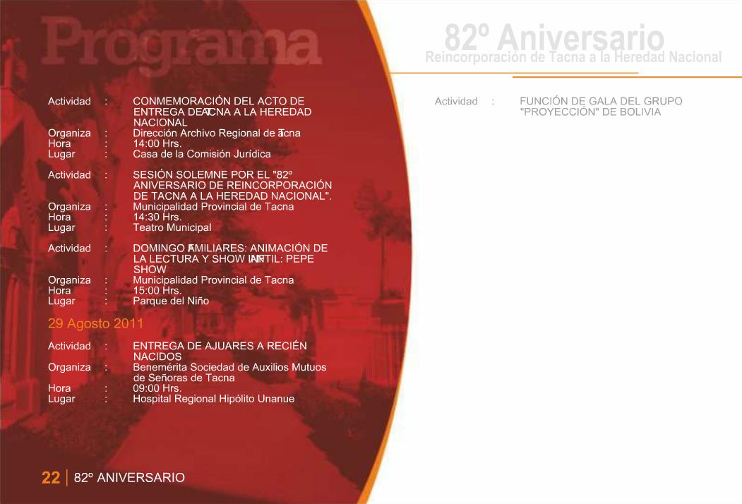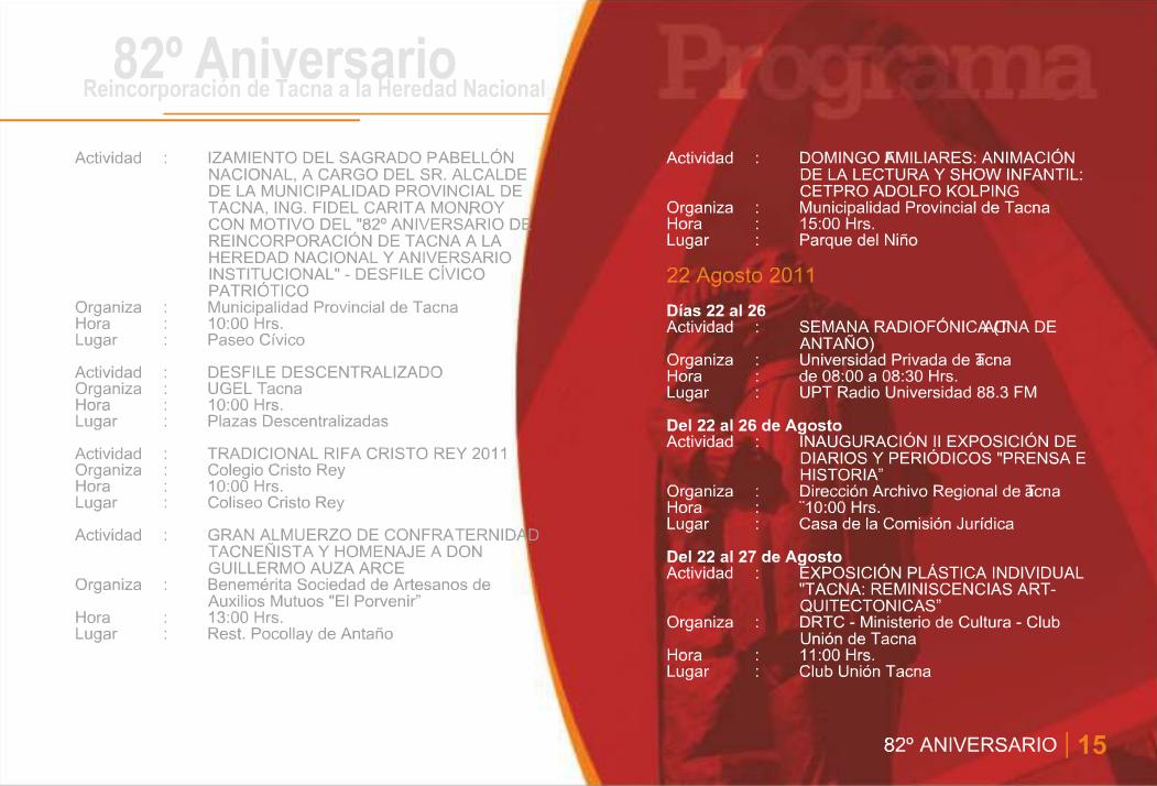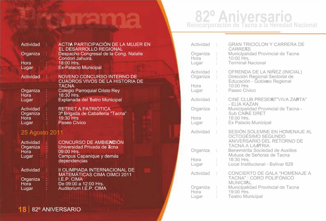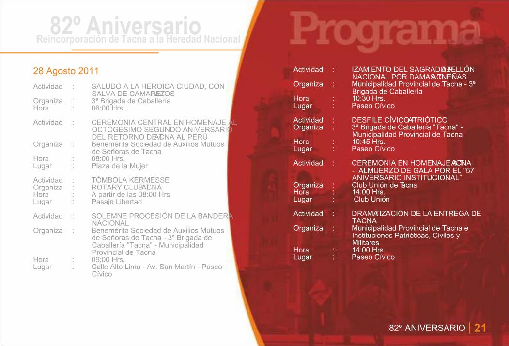 Programa General de Actividades en Conmemoración del 82º Aniversario de la Reincorporación de Tacna a la Heredad Nacional