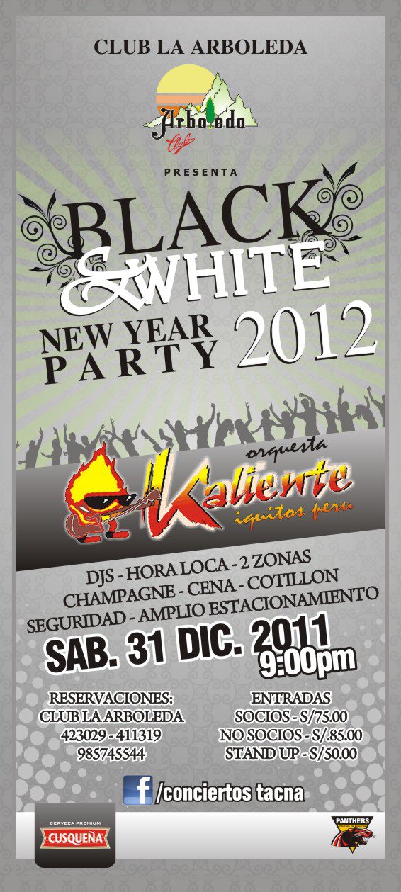 • En el Club La Arboleda (en Pocollay, Km 6 de la Carretera a Calana), habrá la Fiesta Black & White New Year Party 2012, una celebración con DJs, Hora Loca, 2 pistas de baile, champagne, cena, cotillón, seguridad, estacionamiento (o eso dice en sus publicidades, el blog no se hace responsable de que no esté todo ^_^) con la animación de la Orquesta Bahía Internacional y/o la Orquesta Kaliente de Iquitos. Es a partir de las 9 PM.