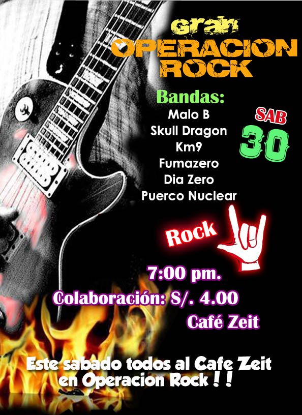 En el Café Zeit (frente a la RENIEC) en el evento titulado Gran Operación Rock se presentarán las nóveles bandas Malo B, Skull Dragon, Km9, Fumazero, Día Zero, y Puerco Nuclear. La colaboración es S/. 4. Empieza a las 7 PM. Puedes ver los detalles en este evento de facebook.