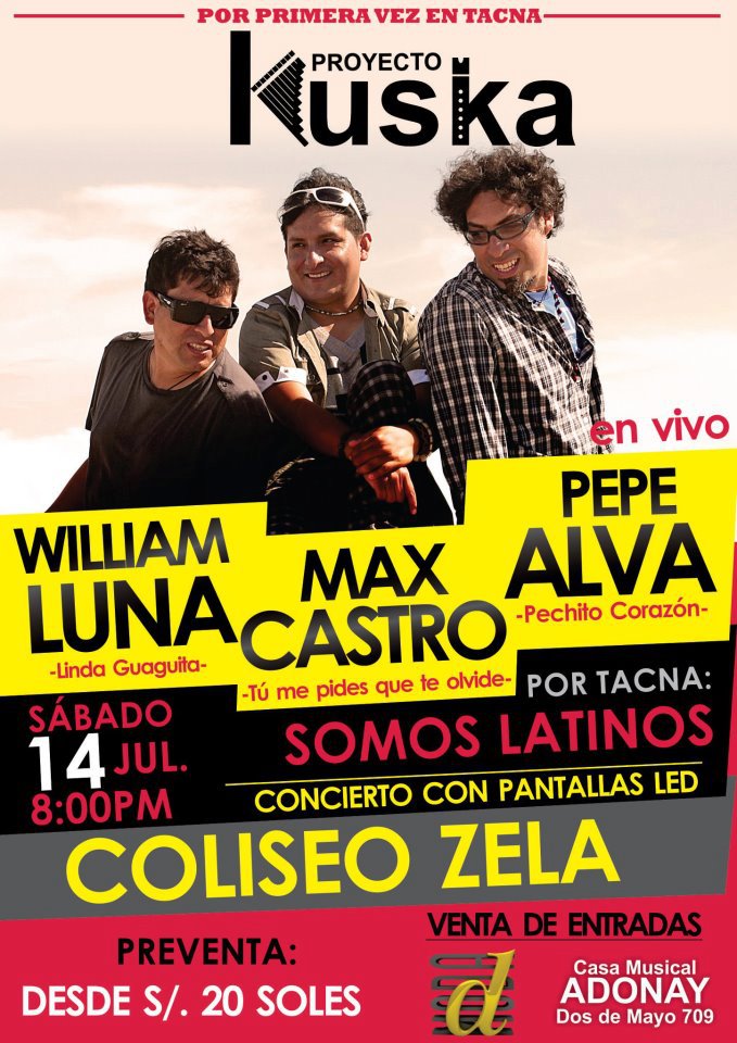- En el Coliseo Zela se realizará un conciertodel Proyecto Kuska, que reúne a los conocidos cantantes William Luna, Max Castro y Pepe Alva. Es desde las 8:00 PM. Entradas desde S/. 20. El evento en facebook acá.