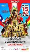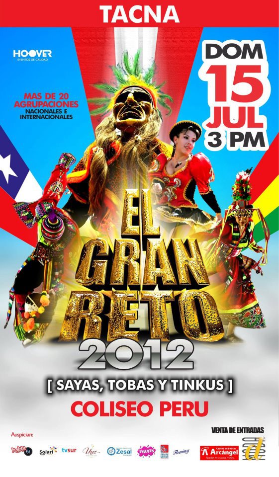 - Nueva edición de El Gran Reto 2012 de tobas, sayas y tinkus. 20 agrupaciones en escena, incluyendo algunas del extranjero. En el Coliseo Perú desde las 3:00 PM. Evento en facebook acá.