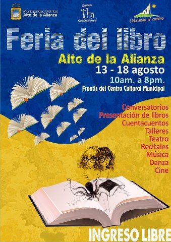 frontis del Centro Cultural del distrito. Es desde las 10 AM hasta las 8 PM. Según su programa oficial se llevarán a cabo un taller de ensayo y otro de poesía, una conferencia sobre el Panorama de la literatura peruana (con participación de Ricardo Vírhuez, Willard Díaz y Goyo Torres), y la presentación de los libros Family values de Mauro Gatica y Antología y Catálogo de Escritores de Arica y Parinacota recopilado y editado por Daniel Rojas. Y para finalizar una reunión de cuentistas donde participarán Percy Prado, Miguel Ildefonso, Gabriela Caballero y Juan Torres Gárate. -